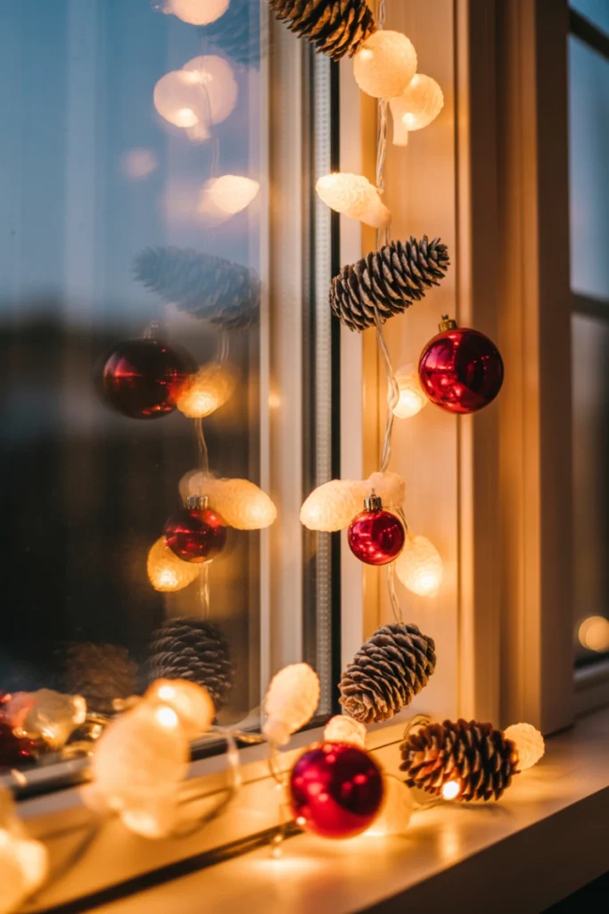 Add a natural twist by weaving pinecones, faux snow, and mini ornaments into frosted string lights. Drape them loosely across your windows for texture and warmth.