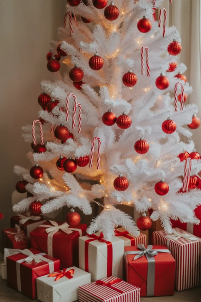 If you want a cheerful and traditional holiday feel, you can’t go wrong with red and white. The vibrant red ornaments pop beautifully against snowy branches, instantly catching the eye. Mix candy-cane stripes, red berries, and glossy baubles to capture that classic Christmas joy.
