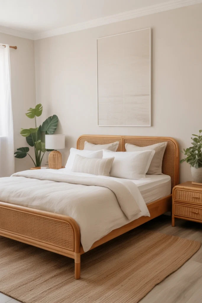 Rattan furniture instantly brings warmth and coastal charm to any bedroom. Its airy texture blends perfectly with beach-inspired themes and works especially well with neutral or pastel color palettes. Whether you choose a rattan headboard, bedside tables, or a lounge chair, the material adds breezy character without feeling heavy. It also complements natural materials like jute, linen, and cotton, creating a cohesive and inviting atmosphere.