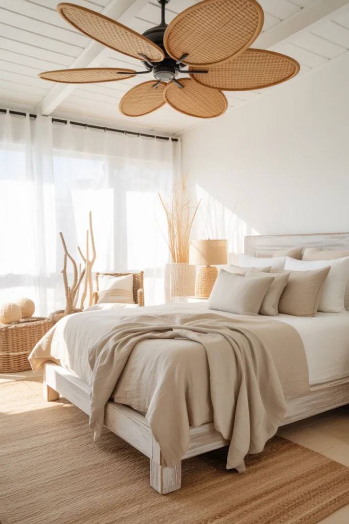 A ceiling fan with woven blades or coastal-inspired finishes enhances both comfort and style. It brings practicality to the bedroom while reinforcing the beach theme. Woven or palm-style blades introduce organic texture, while white or brushed-nickel finishes maintain a clean look.