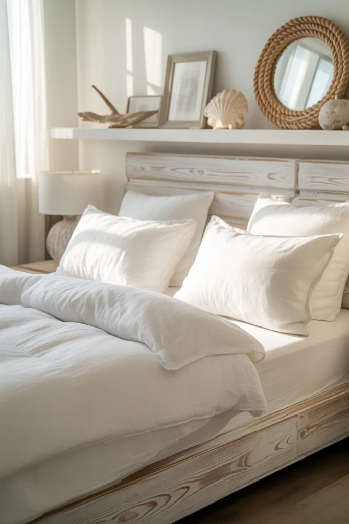 White bedding pairs well with any coastal color palette, whether soft pastels or deep navy accents. Adding textured throws, patterned pillows, or woven bedside accessories enhances the overall design. The combination of white textiles and natural elements creates a serene, hotel-like environment perfect for relaxing.