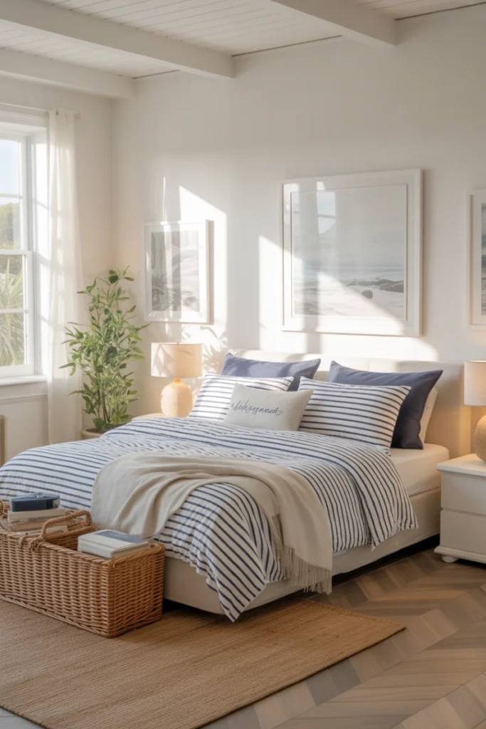 Placing baskets near the bed, under a bench, or inside an open closet enhances both organization and design. They pair well with linen fabrics, white furniture, or rattan pieces. Adding multiple baskets in varying sizes creates visual interest while maintaining practicality. Together, these elements contribute to a well-organized and charming coastal atmosphere.