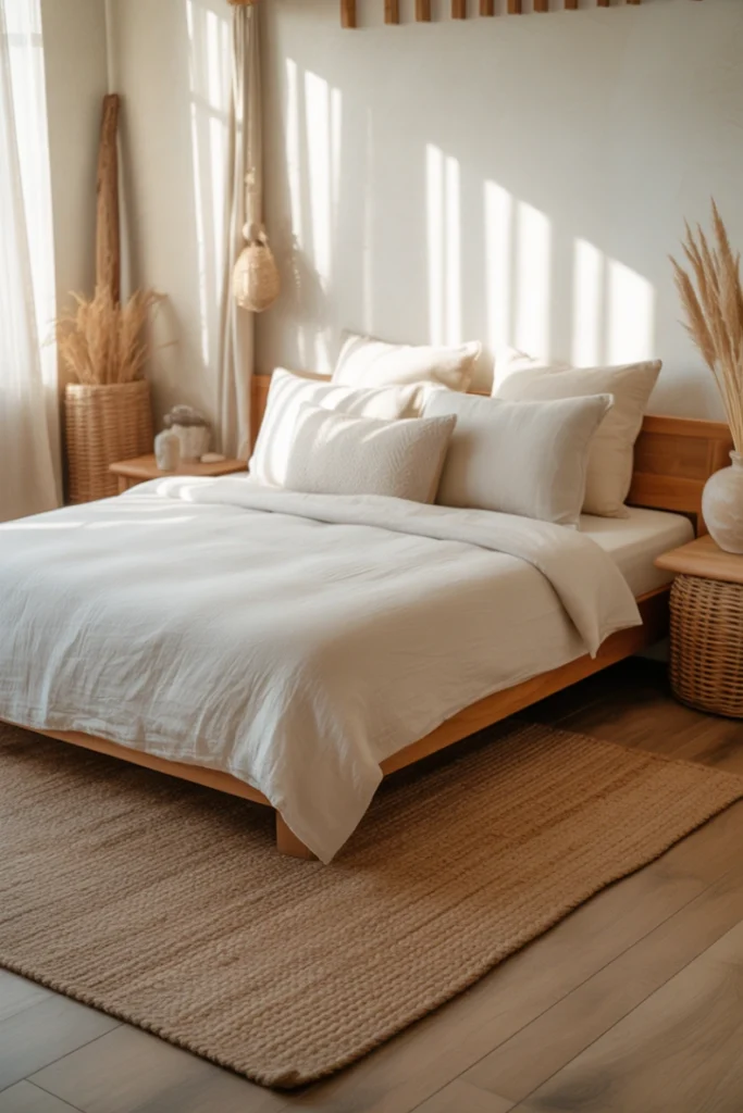 Beyond aesthetics, jute rugs are durable and practical, making them excellent for high-traffic bedroom areas. You can layer them with smaller patterned rugs for added depth or place them beneath the bed for structure. To complete the coastal ambiance, add wicker decor, woven pendant lights, or linen curtains. Together, these elements create a bedroom that feels warm, organic, and refreshing.
