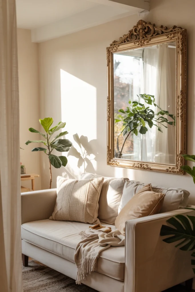 Mirrors help small apartments feel brighter and more open. When placed near windows, they reflect natural light and enhance depth. Decorative frames add warmth and character.