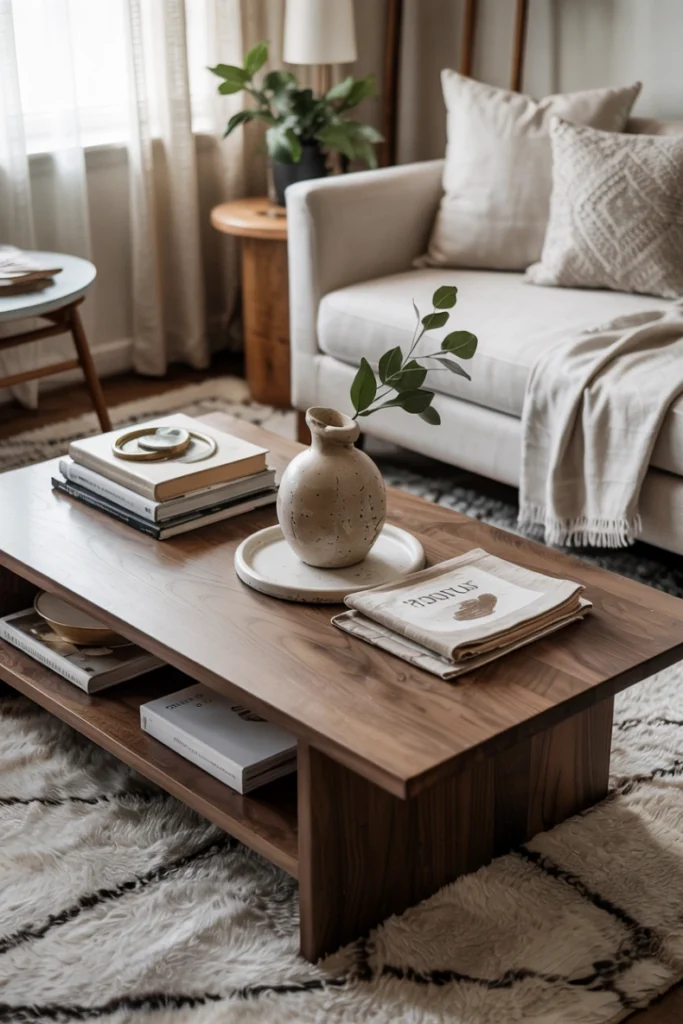 Styling surfaces such as coffee tables and shelves adds personality without clutter. Layering books, trays, and decorative objects creates visual interest while maintaining simplicity.