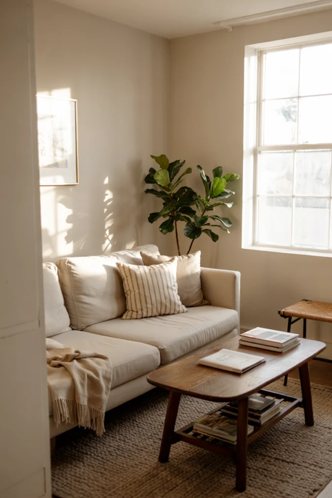 Mixing wood with neutral fabrics enhances visual harmony. As Cozy Apartment Makeover Ideas suggest, incorporating natural materials helps create a grounded, timeless atmosphere that feels comforting and welcoming.