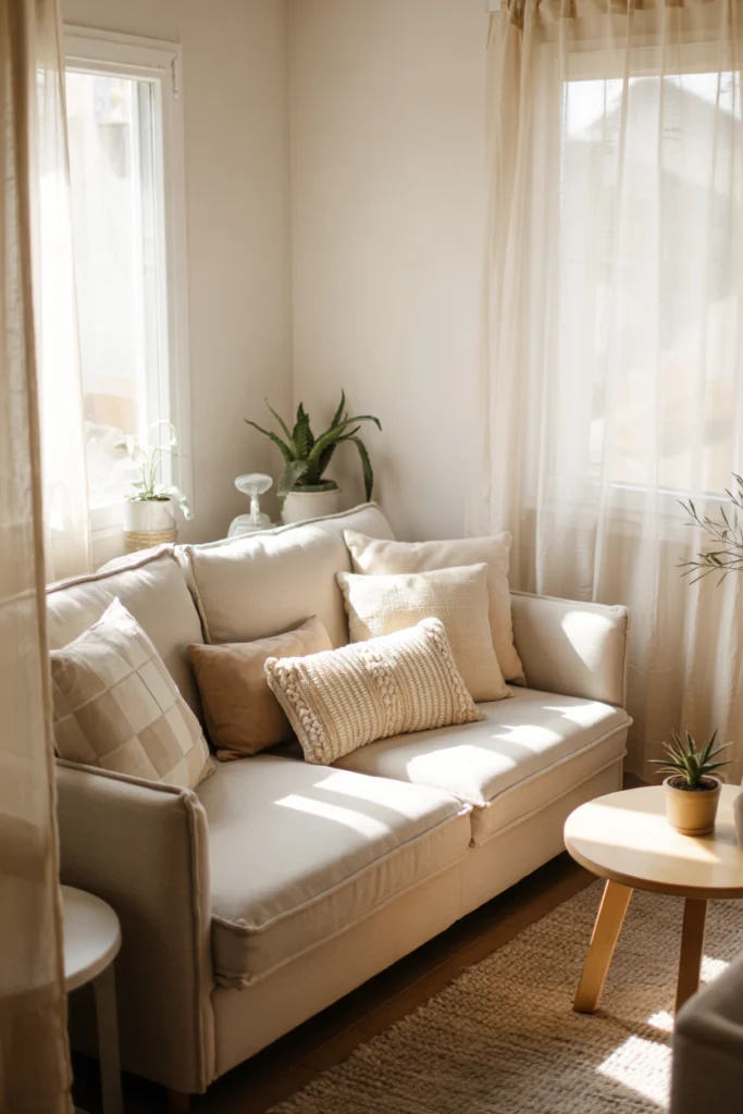 Curtains significantly influence how a small apartment feels. Heavy or dark window treatments can make rooms feel closed off, while lightweight fabrics soften incoming light and enhance openness. Sheer or linen curtains allow natural light to flow while maintaining privacy.