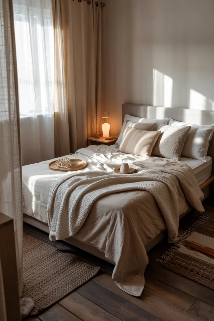 The bedroom should feel like the most comforting space in a small apartment. Layered bedding with duvets, quilts, throws, and cushions creates a plush, inviting environment. Neutral tones combined with soft textures enhance relaxation.