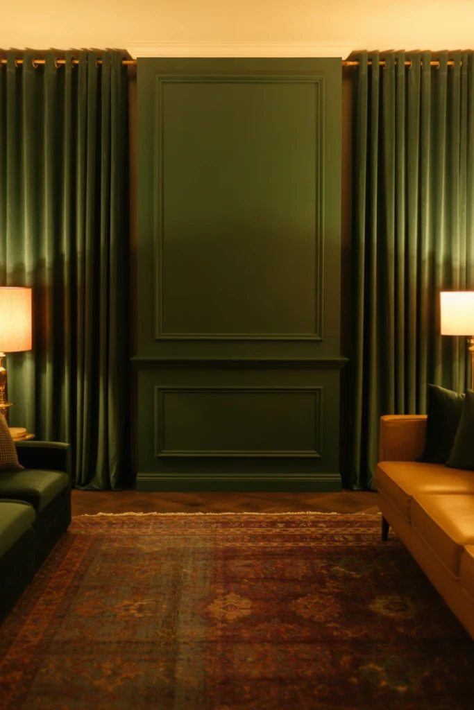 Adding dark green to paneled walls gives your living room instant dimension. Whether you opt for full wainscoting or modern slatted panels, the color highlights every groove and adds architectural interest.