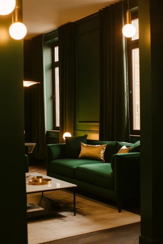 Bring a touch of 1920s glam to your space with an Art Deco-inspired dark green living room. Pair rich emerald tones with gold geometric details, marble surfaces, and plush fabrics.