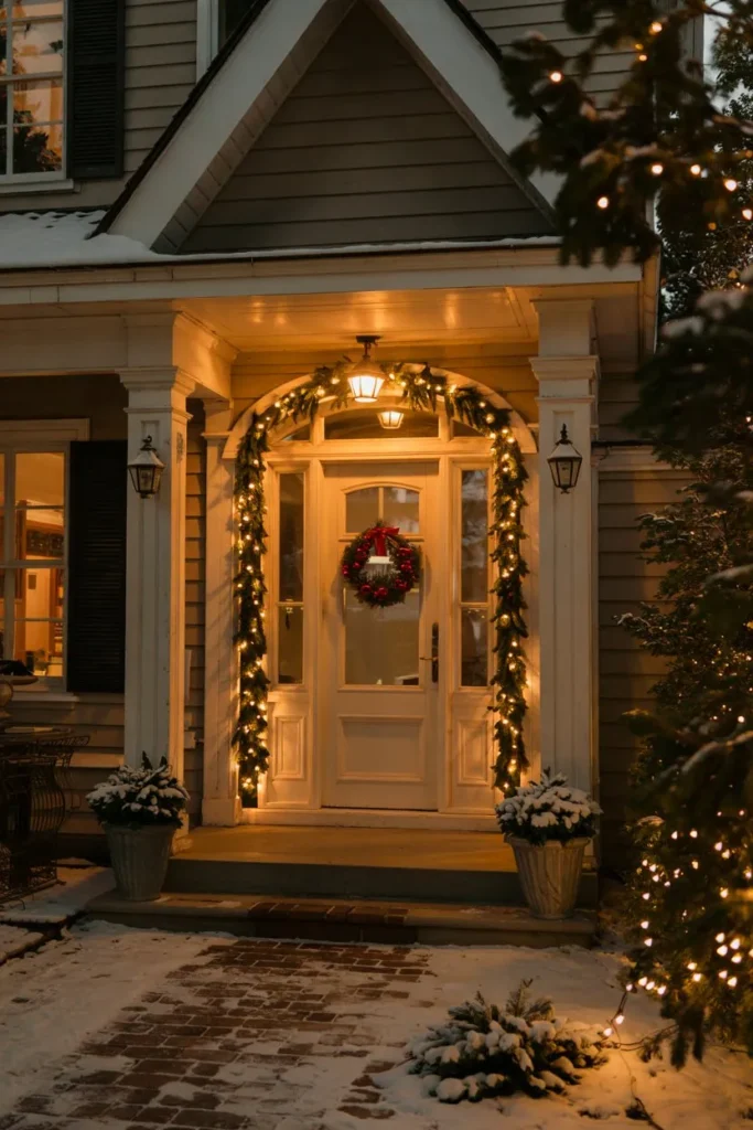 Add a timeless touch by wrapping your porch railings in lush green garland intertwined with twinkle lights. Secure the garland with red ribbons or bows for a pop of color.