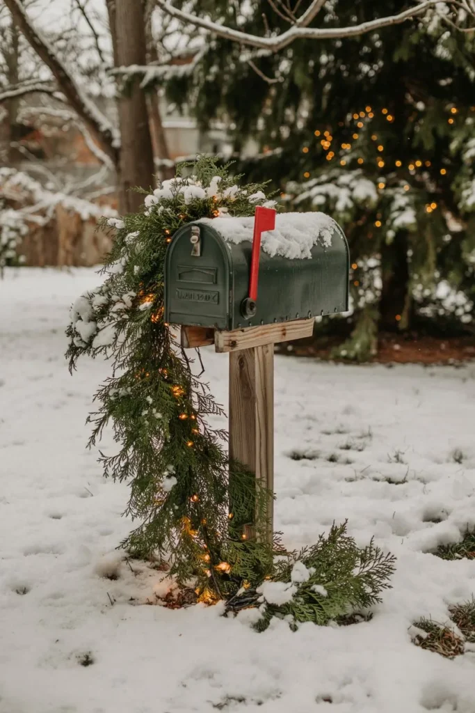 Wrap your mailbox in festive garland and red bows. Add small ornaments and a touch of faux snow spray to complete the look.