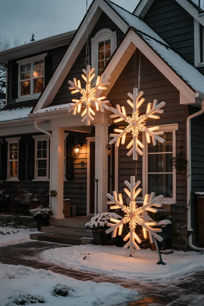 Cut giant snowflake shapes from plywood or foam boards and paint them white or silver. Outline them with LED rope lights to make them shine at night.