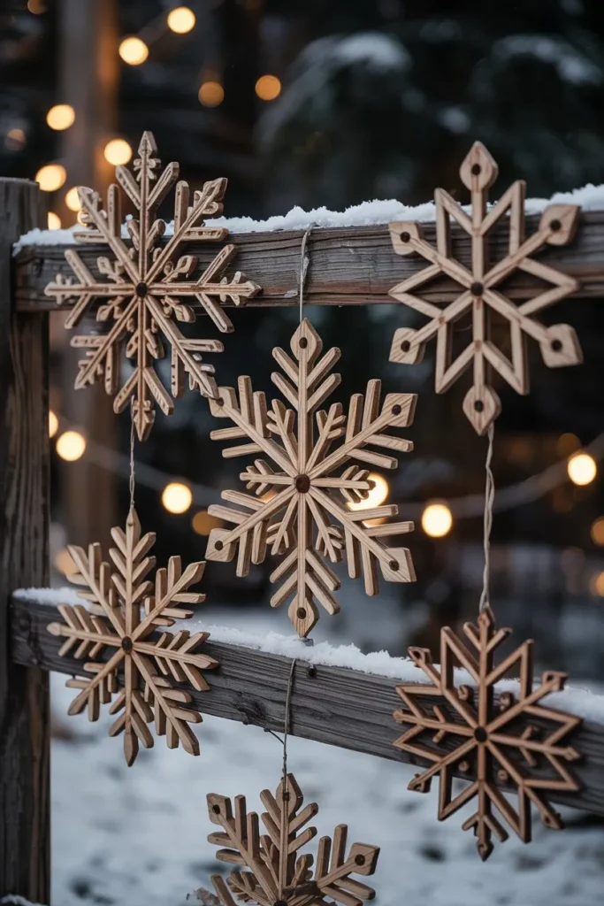 Use reclaimed wood to create large snowflake cutouts. Paint them white and mount them on your fence, walls, or porch posts.