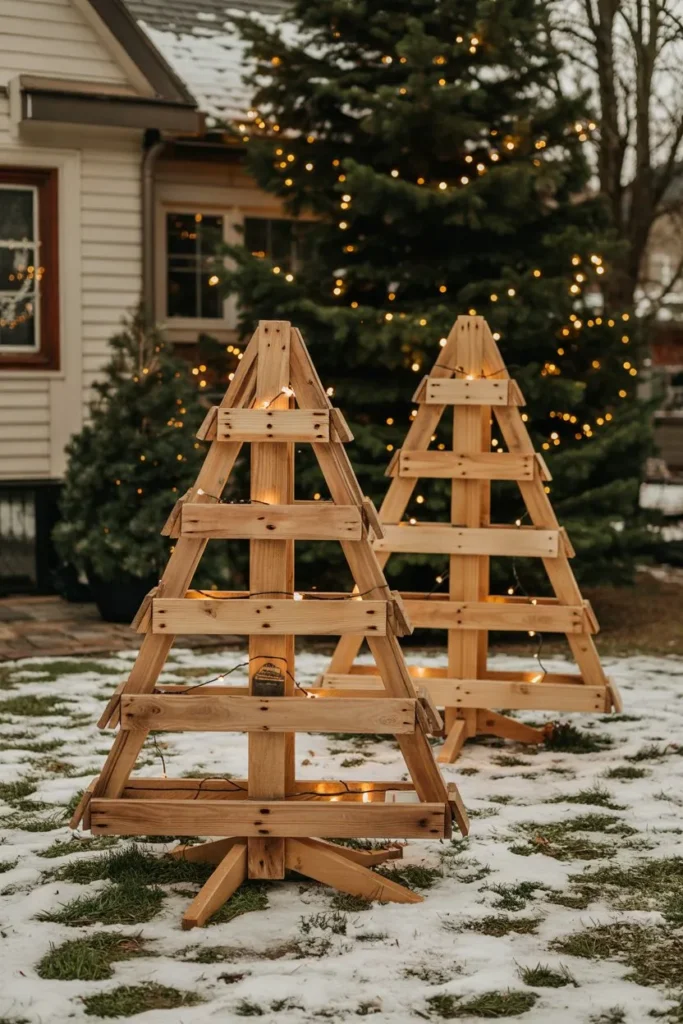 Upcycle old pallets into rustic Christmas trees that stand out in your yard. Cut the boards into triangle shapes, sand the edges, and paint them green or white. Add ornaments, fairy lights, or even hand-painted stars for a personal touch.