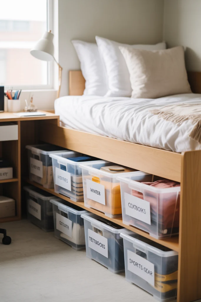 Under-bed storage is essential for maintaining a clutter-free dorm room. Using bins, drawers, or rolling organizers helps maximize hidden space while keeping belongings easily accessible. This approach is extremely practical for storing extra bedding, seasonal clothing, textbooks, or cleaning supplies. Clear containers also help you locate items quickly.