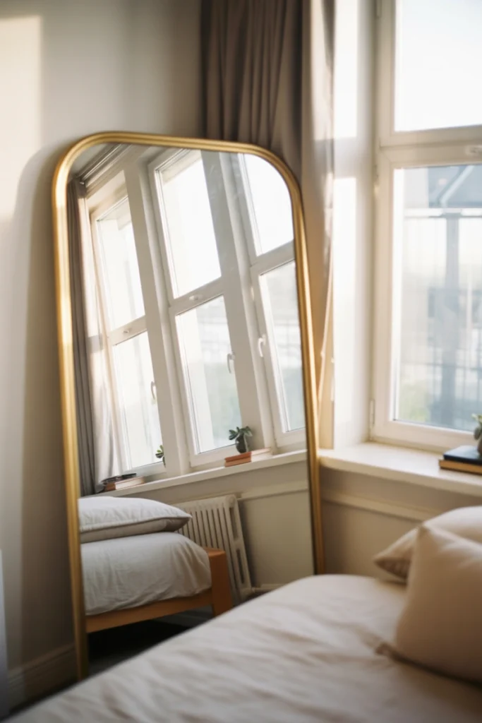 Mirrors are excellent for making small dorm rooms feel larger and brighter. Full-length mirrors or decorative wall mirrors reflect natural and artificial light, enhancing the room’s openness. Mirrors can also serve functional purposes for getting ready, adjusting outfits, or applying makeup.