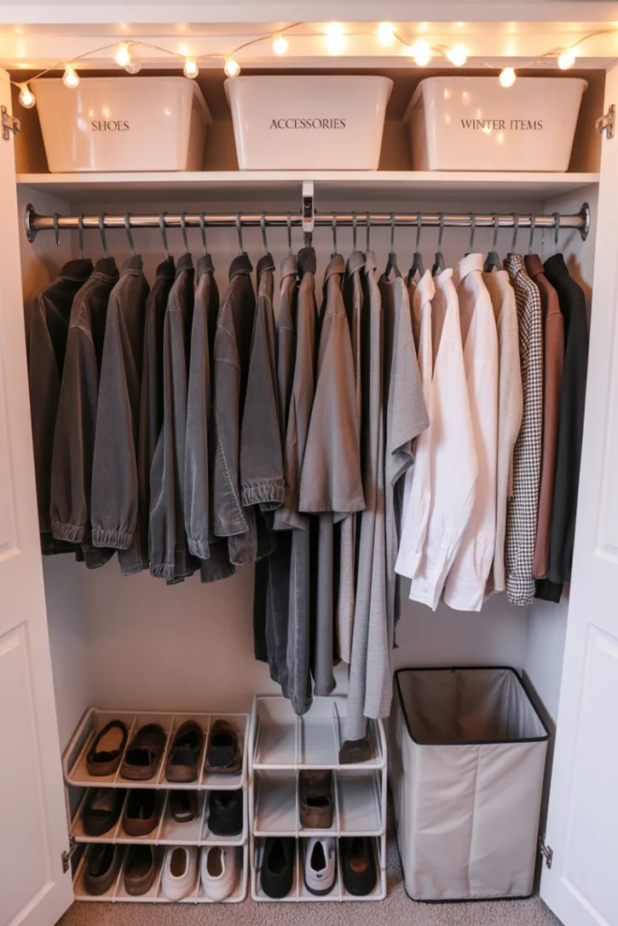 Closets in dorm rooms are often small, but aesthetic organization can make them both functional and visually appealing. Coordinated hangers, labeled baskets, and vertical storage solutions help maximize space. Adding shelf dividers or hanging organizers improves accessibility while keeping items neatly arranged.