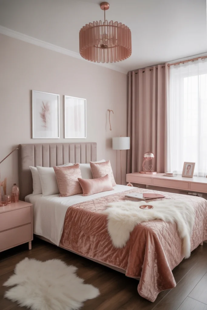 A modern glam dorm room brings sophistication into a small space by combining metallic accents, plush textiles, and a refined color palette. Gold, rose gold, or chrome elements pair beautifully with soft colors like blush pink, white, or charcoal gray. Velvet pillows, faux fur throws, and stylish lamps can add a luxurious feel without overwhelming the room. This style transforms an ordinary dorm into a chic and polished retreat.