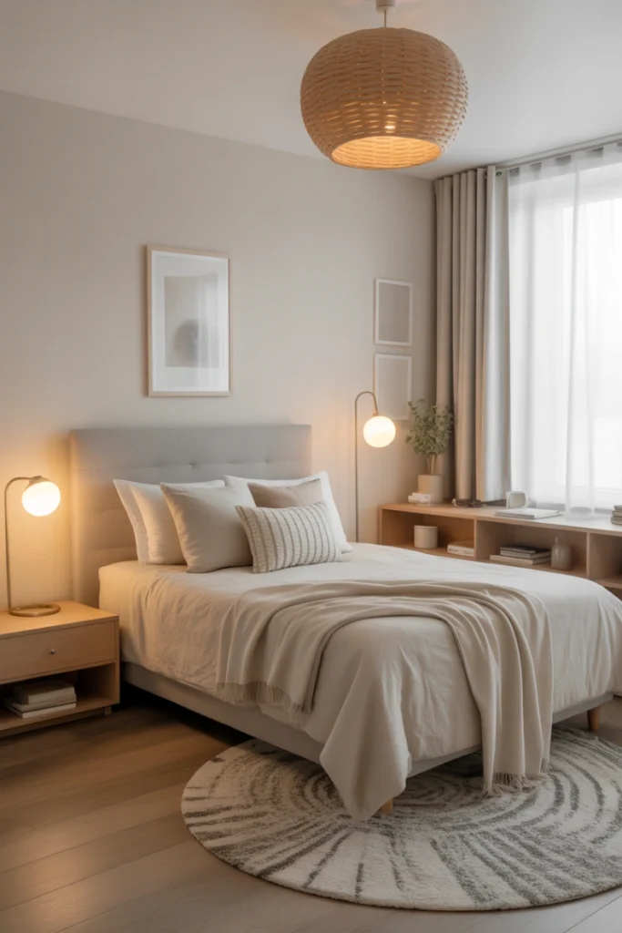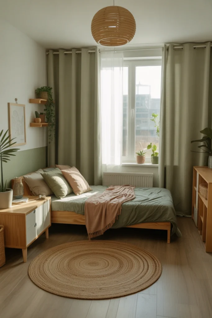 Natural textures like jute rugs, bamboo storage baskets, and linen bedding help soften the room and create visual harmony. This decor style pairs beautifully with warm lighting elements that mimic sunlight. As a result, the room feels more refreshing and grounded, making it easier to focus, relax, and recharge.