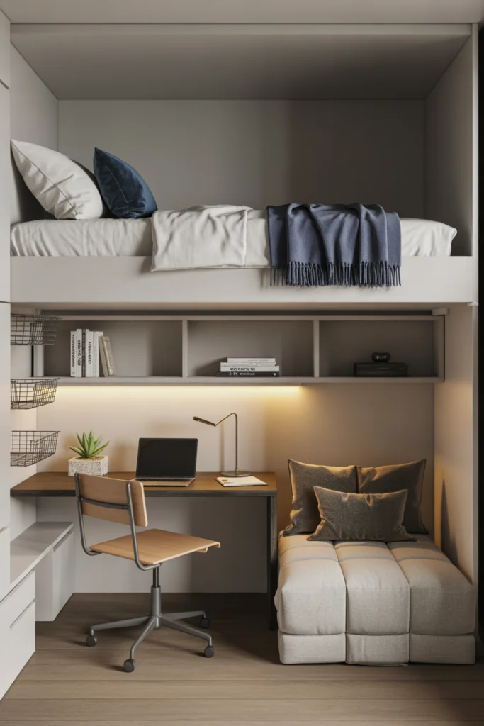 Decorating the lofted area is key to making the space feel comfortable and personalized. Add curtains, LED lights, or wall art to define the lower zone without cluttering it. If used as a lounge area, incorporate cushions, beanbags, or a compact futon to create a relaxing retreat. A lofted setup is ideal for students who prefer multi-functional layouts.