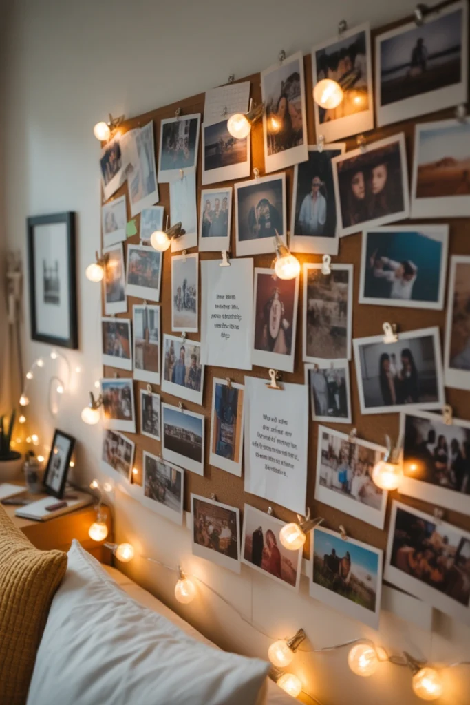 A photo wall adds personality to your dorm room by showcasing memories, inspirations, and important moments. You can use a combination of printed photos, postcards, magazine clippings, or inspirational quotes arranged in a grid or collage pattern. This creates a focal point that draws attention and instantly elevates the atmosphere. It also helps make the space feel uniquely yours even when living far from home.
