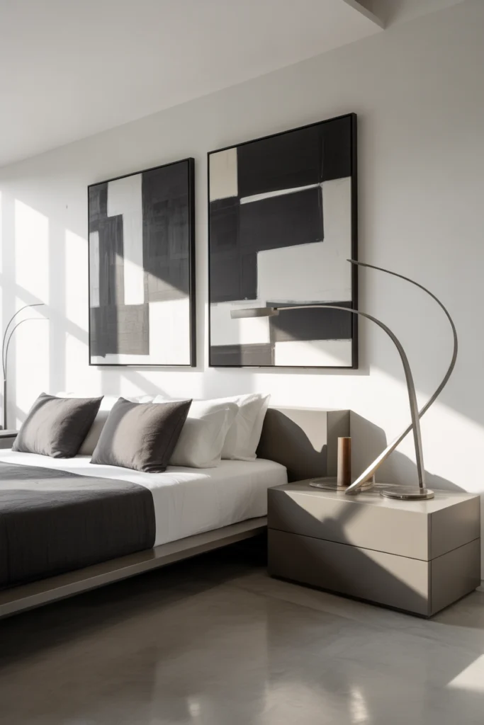 If you love creativity and expression, a contemporary art-inspired bedroom lets your personality shine. Start with a neutral base white or gray walls and let bold artwork or graphic prints add vibrancy. Sculptural furniture, modern lighting, and statement decor pieces bring an urban, gallery-like atmosphere.