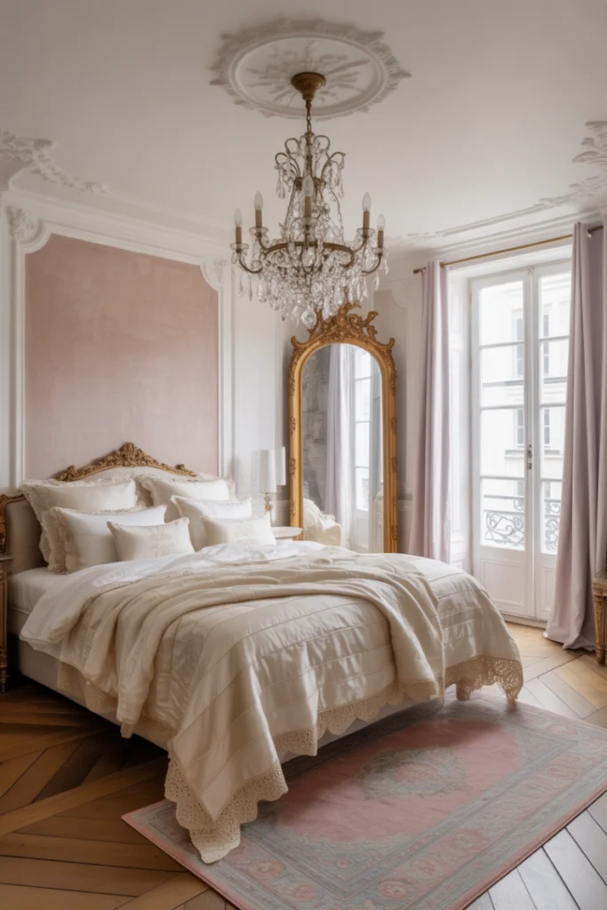For a touch of European sophistication, the Parisian bedroom aesthetic blends elegance with effortlessness. Picture intricate molding, soft fabrics, and vintage details that feel timeless rather than trendy. Start with a muted palette creams, blush tones, and light grays and build on it with crystal lighting and refined upholstery.