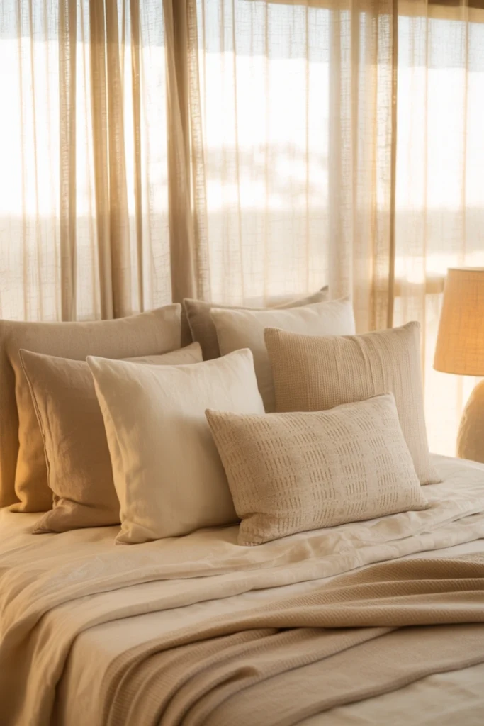 Play with neutral tones or tone-on-tone shades for an elegant finish. Fluffy pillows, decorative cushions, and a plush throw draped casually over the bed instantly elevate the aesthetic. Every layer adds depth, making your bedroom feel cozy, curated, and perfectly dreamy.