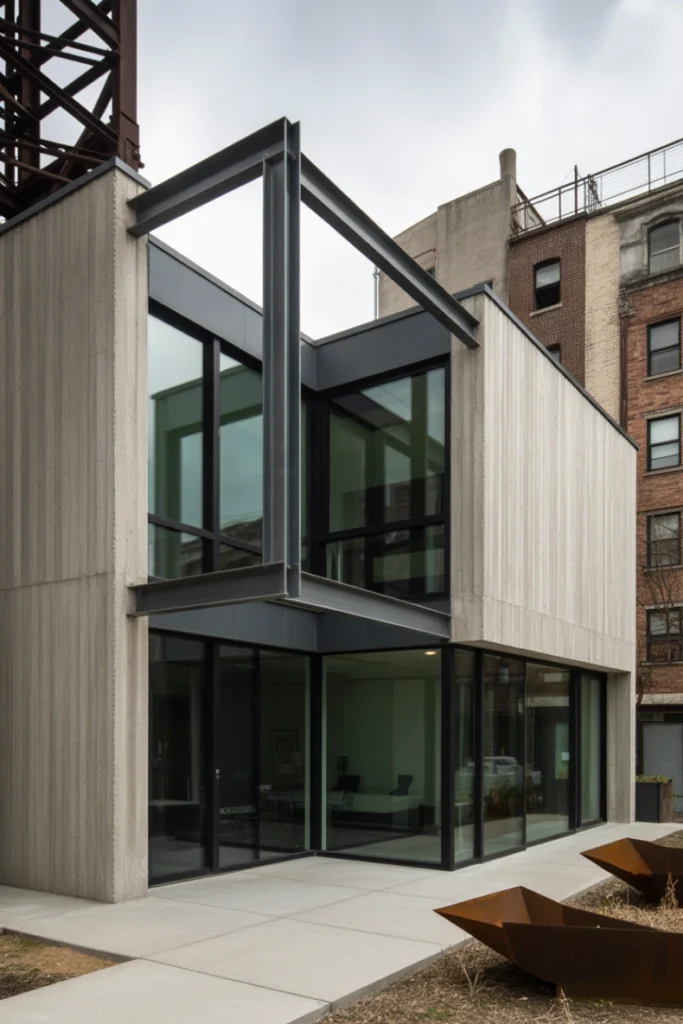 Industrial exterior house style ideas draw inspiration from urban warehouses and factories. Exposed concrete, steel, brick, and large windows define this bold architectural approach. The focus is on raw materials and structural honesty.
