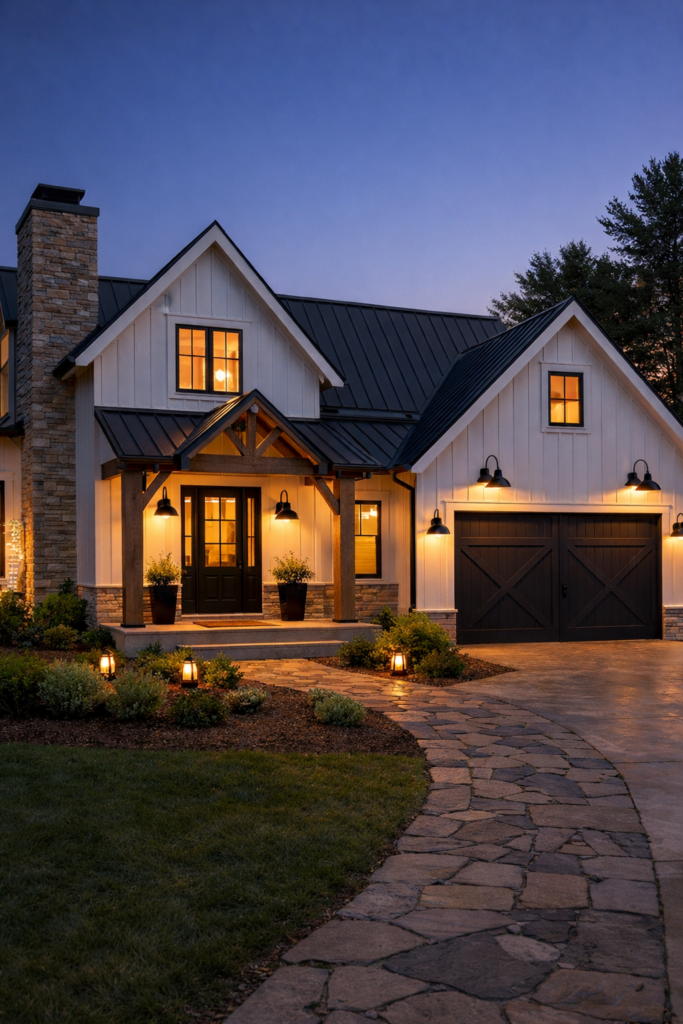 Farmhouse exterior house style ideas blend rustic charm with modern comfort. Originally inspired by rural homes, this style features gabled roofs, large porches, and simple, functional forms. Board-and-batten siding, wood accents, and metal roofing elements are common features that add character and warmth.