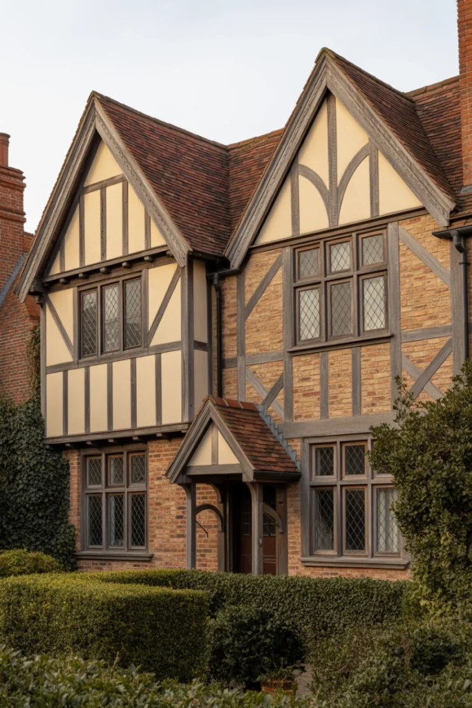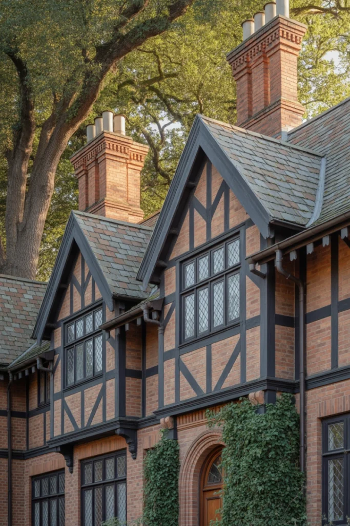 Tudor exterior house style ideas are characterized by steep gabled roofs, decorative half-timbering, and brick or stucco facades. This style offers a distinctive European appearance with strong visual identity.