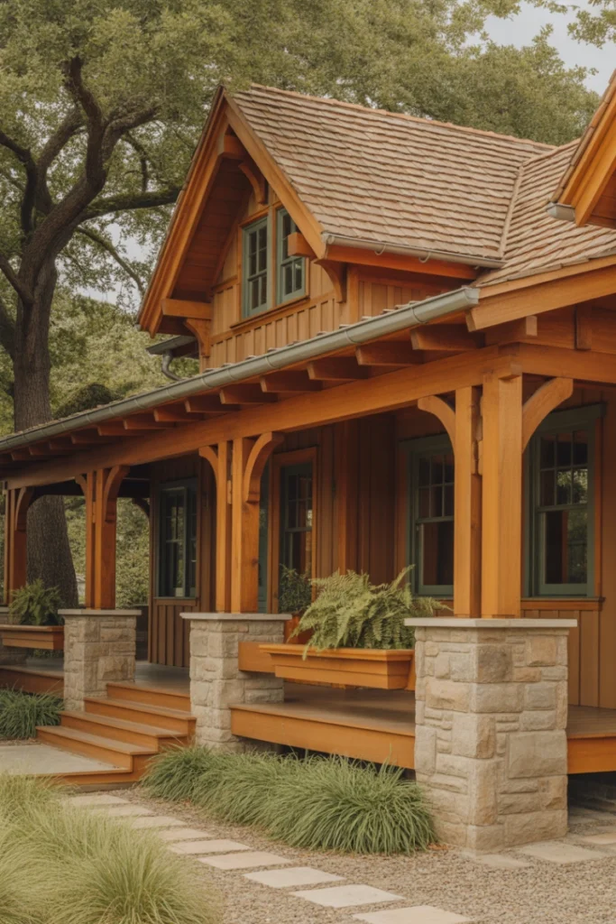 Rustic exterior house style ideas celebrate natural materials and rugged textures. Wood, stone, and earthy colors create a strong connection to the surrounding environment.