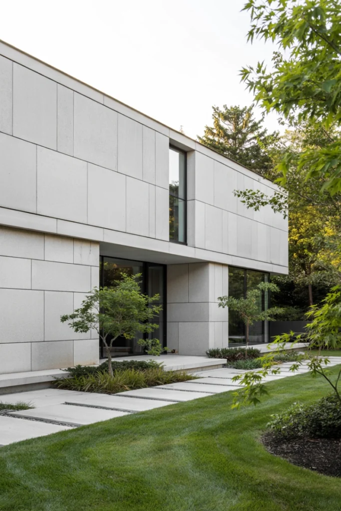 This style suits urban and coastal modern homes. As Exterior Wall Panel Ideas show, light panels enhance brightness and simplicity.
