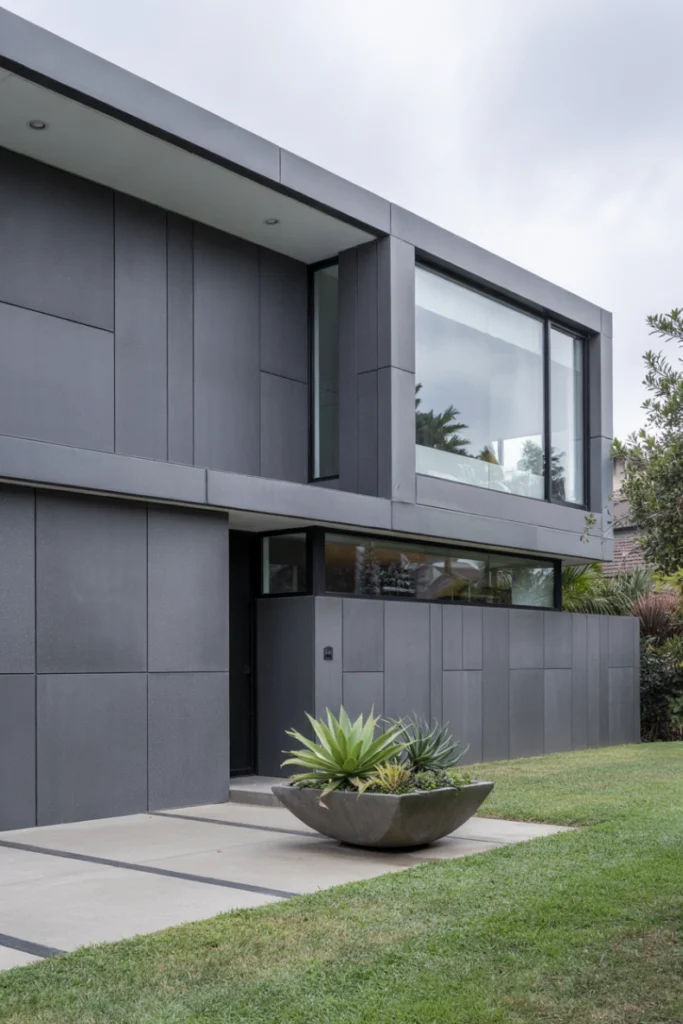 Dark exterior panels create dramatic modern facades. Charcoal, black, or deep gray tones emphasize architectural form and contrast.