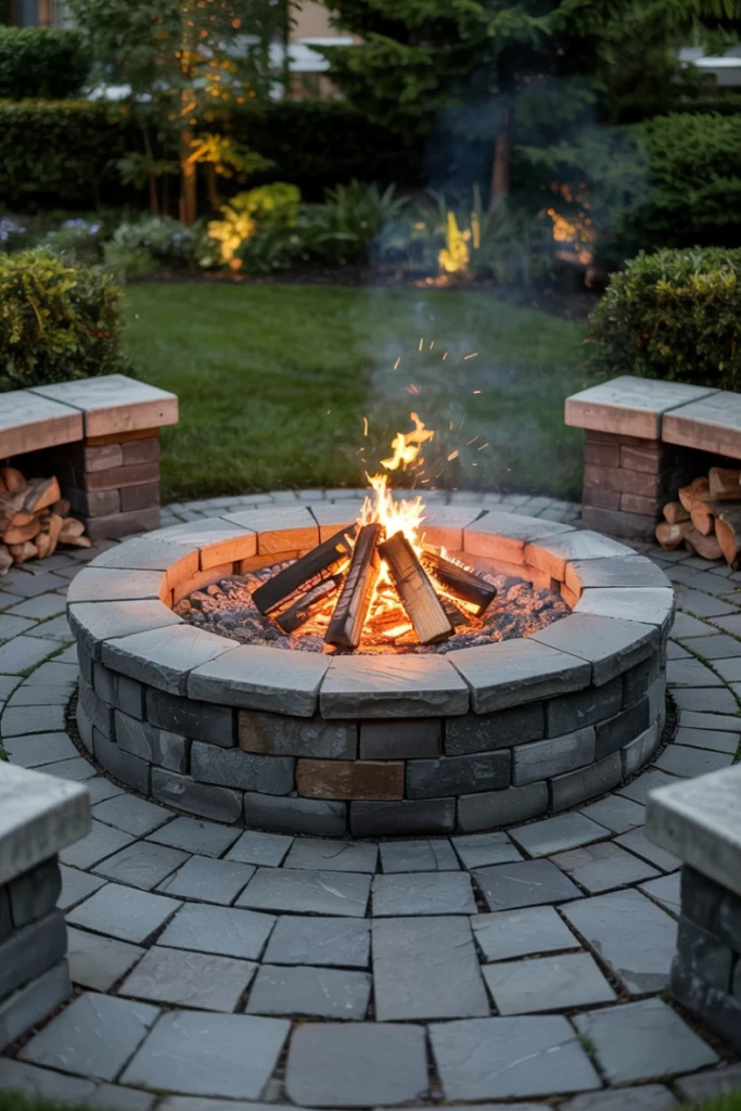 The circular form works well in both formal and informal gardens. It encourages interaction and creates a strong focal point that draws people together. This is one of the most socially engaging fire pit garden ideas.
