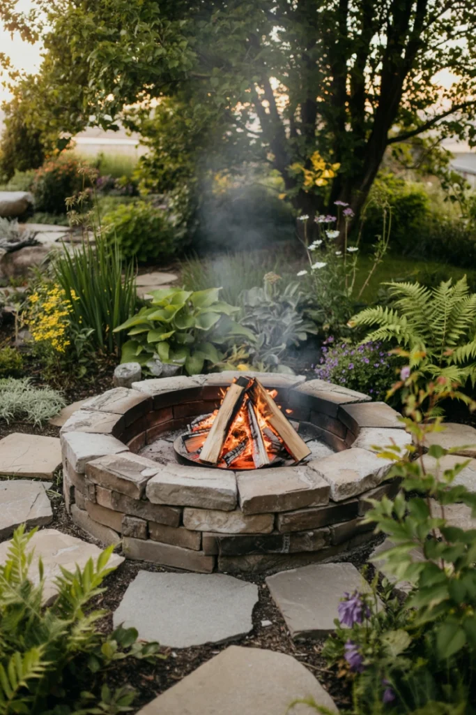 This design is particularly well suited for country homes or gardens that embrace a naturalistic landscape. The fire pit becomes a place for storytelling, slow evenings, and meaningful connection with nature. Over time, weathered stone only adds to the charm, making this one of the most enduring fire pit garden ideas available.