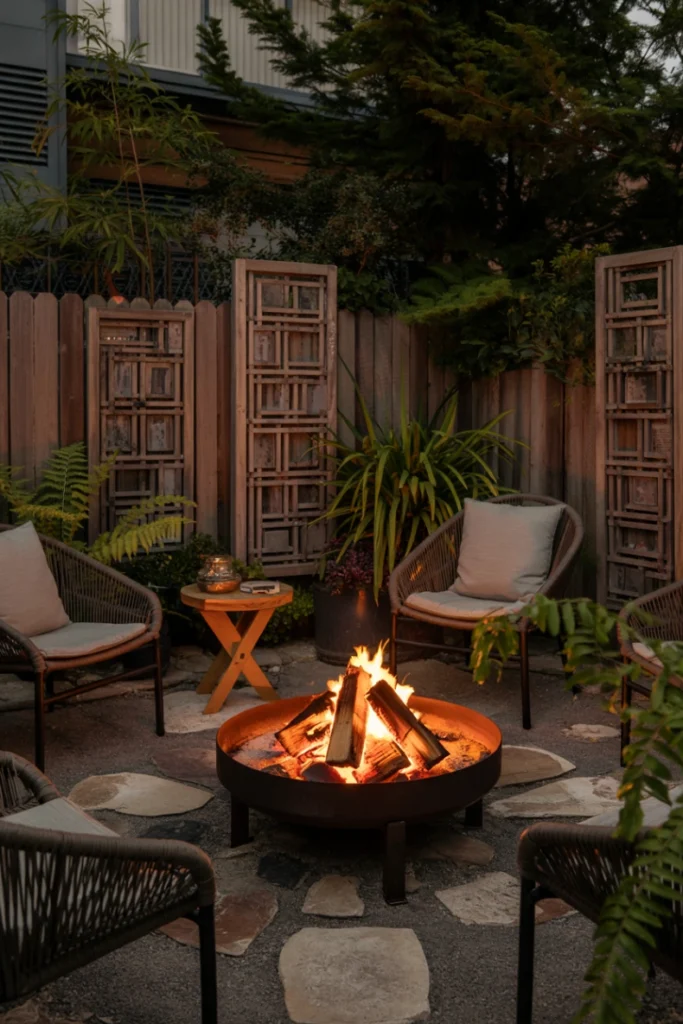 Privacy screens enhance comfort by shielding the fire pit area from wind and neighboring views. Materials such as wood slats, metal panels, or tall plants can be used. This creates a secluded retreat within the garden.