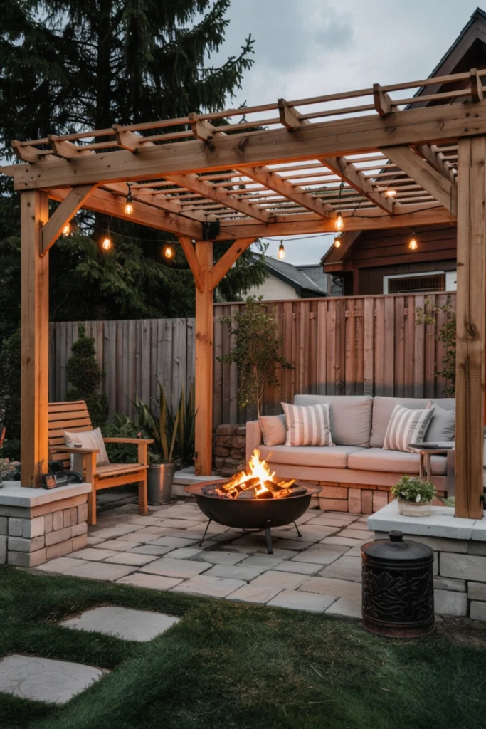 Adding a pergola above a fire pit creates a defined outdoor room that feels intentional and inviting. Wooden or metal pergolas provide structure without fully enclosing the space, allowing smoke to disperse while offering partial shade and visual interest. Hanging lights or climbing plants can enhance the atmosphere.
