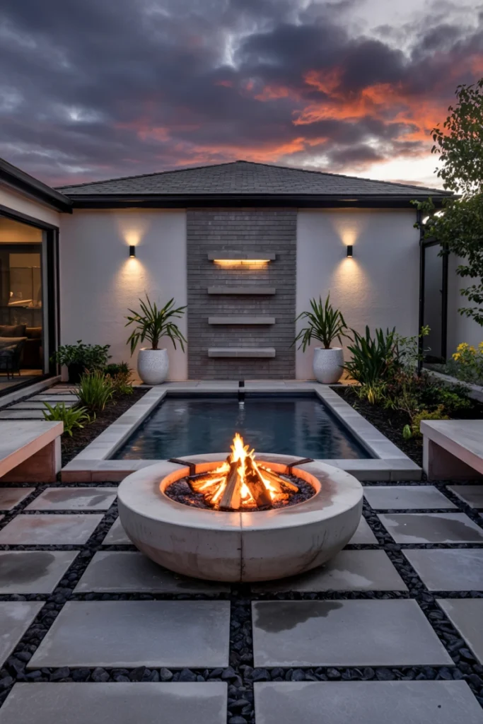 Combining a fire pit with a water feature creates a striking contrast that engages multiple senses. The movement of water softens the intensity of the fire, resulting in a balanced and calming environment. This design often uses modern materials like concrete and steel for a polished look.