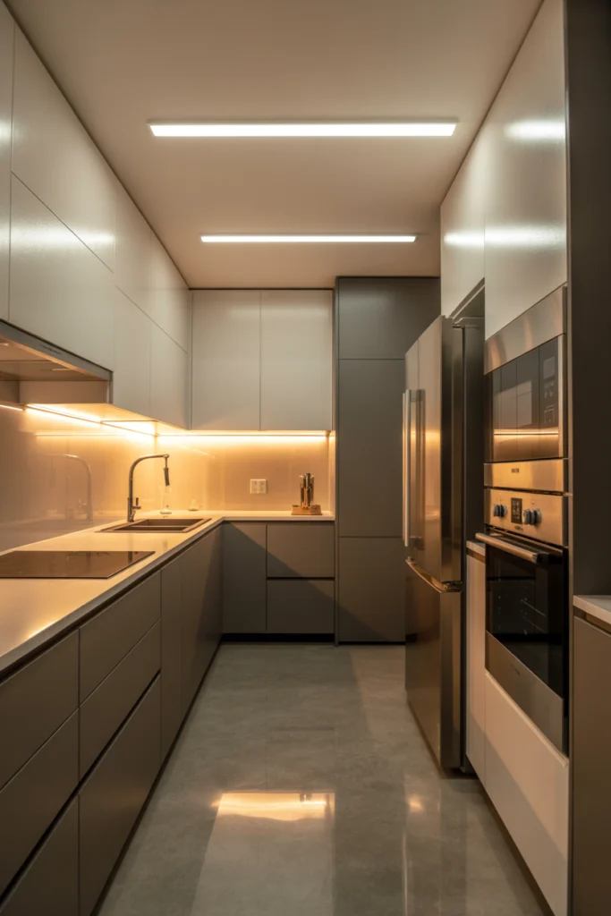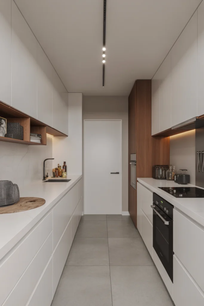 A modern minimalist galley kitchen focuses on clean lines, hidden storage, and clutter-free surfaces. Light colors like white, beige, or soft gray enhance the sense of space, while handleless cabinets create a seamless look that visually widens the room. To maintain an uncluttered feel, built-in appliances and pull-out pantries help keep essentials stored neatly. Minimal lighting, such as slim LED strips under cabinets, gives the kitchen a modern glow while ensuring clear visibility for everyday cooking.
