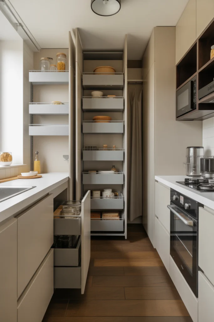Smart storage turns limited space into an efficient and well-organized kitchen. Pull-out spice racks, vertical dividers, rotating corner units, and deep drawers help maximize storage capacity without overcrowding the walkway. Over-cabinet storage adds additional room for seasonal or rarely used items. With strategic design, even the smallest galley kitchen can support extensive storage.