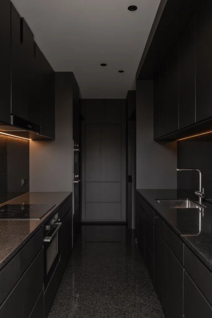 An all-black galley kitchen delivers bold sophistication and a strong architectural presence. Matte black cabinets paired with black stone countertops create a refined monochromatic look. This design works especially well when paired with stainless steel appliances or light wood flooring, creating a balanced contrast.