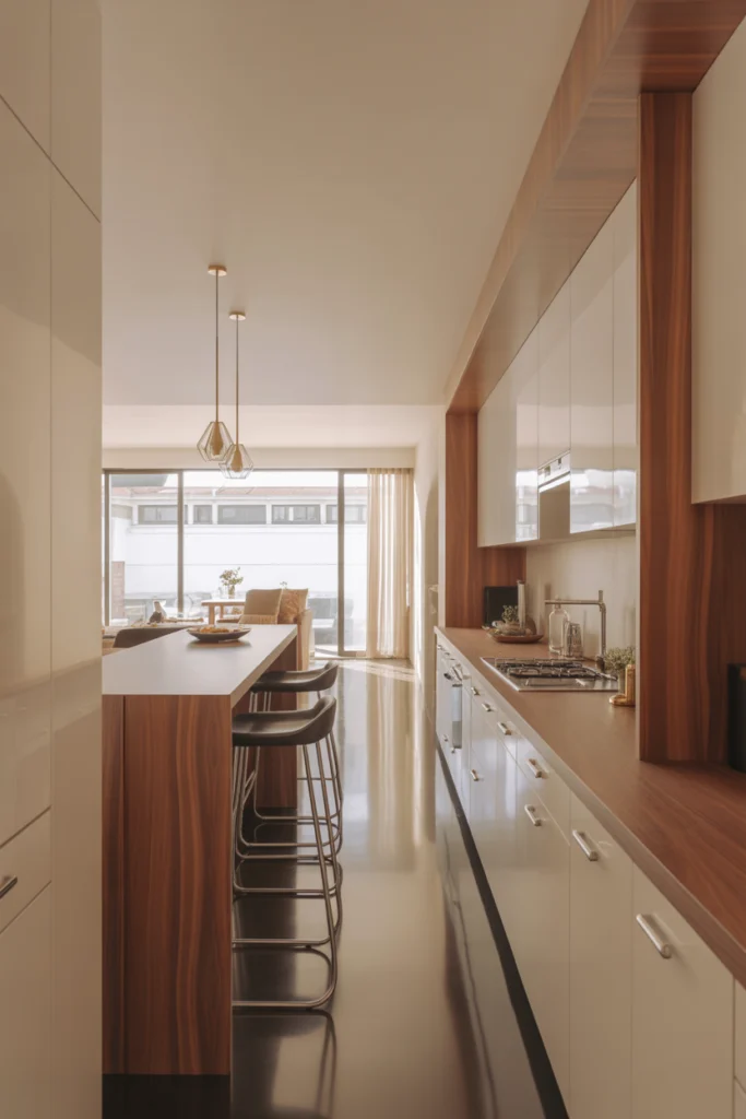 Structurally, a peninsula or extended countertop offers separation between the kitchen and living space. The extension prevents the galley from feeling overly narrow while providing a welcoming feature for families or guests. Paired with bar stools and pendant lighting, the kitchen becomes more interactive and stylish.