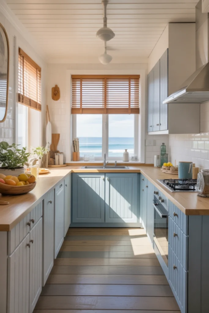 Functionally, coastal kitchens emphasize practicality with easy-to-clean surfaces and natural lighting. Glass cabinet doors or glossy finishes reflect light, brightening the narrow space. Decorative touches such as rope details or soft blue tiles add personality without overwhelming the overall design.