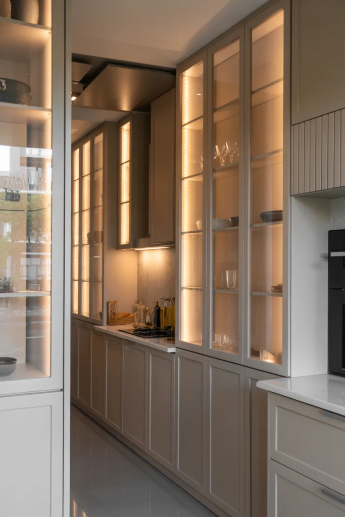 Functionally, glass cabinets encourage organized storage because contents remain visible. Frosted glass offers a balance by concealing clutter while maintaining aesthetic appeal. Paired with soft LED lighting, glass cabinets become a striking feature that elevates the entire kitchen design.