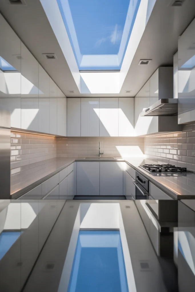 A skylight dramatically transforms a long, narrow kitchen by introducing abundant natural light. Bright sunlight makes the space feel open and airy, counteracting the enclosed nature of galley layouts. Skylights work especially well in homes with limited window access, providing a visually refreshing atmosphere.