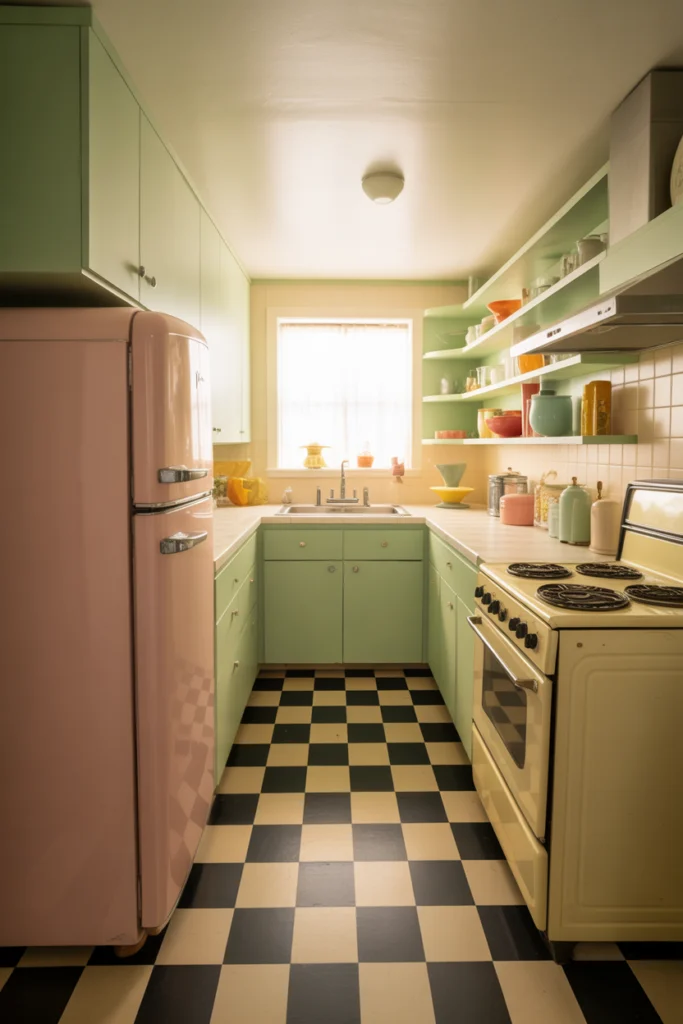 Retro designs bring nostalgic charm to narrow kitchens through playful colors, patterned flooring, and classic hardware. Soft pastels, checkerboard tiles, and vintage appliances create a warm and lively atmosphere. Despite the small footprint, a retro theme adds visual interest without relying on large decorative elements.