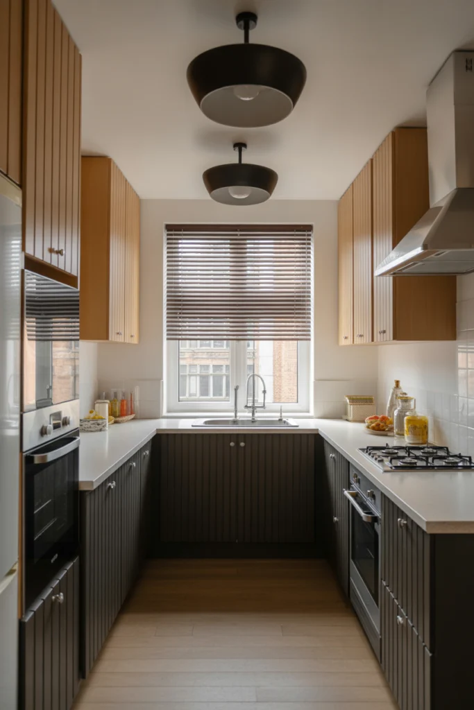 Two-tone cabinetry adds visual depth and allows homeowners to highlight specific areas in a galley space. Dark lower cabinets paired with lighter upper cabinets help visually lighten the top portion of the room while grounding the base. This layering effect prevents the kitchen from feeling narrow or tunnel-like. Two-tone kitchens work well with various materials, including wood textures, lacquer, matte laminates, or painted cabinets. The contrast introduces personality without overwhelming the small layout.