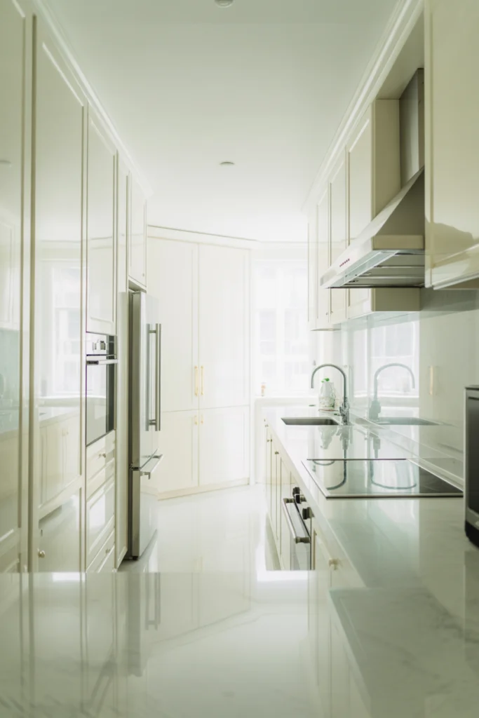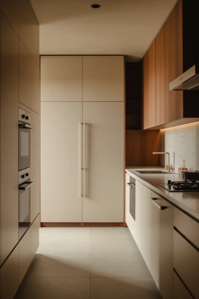 Integrated appliances create a seamless and organized appearance ideal for narrow galley layouts. Built-in ovens, panel-ready refrigerators, and concealed dishwashers blend with cabinetry to create a cohesive and streamlined design. This reduces visual clutter and makes the kitchen appear larger.